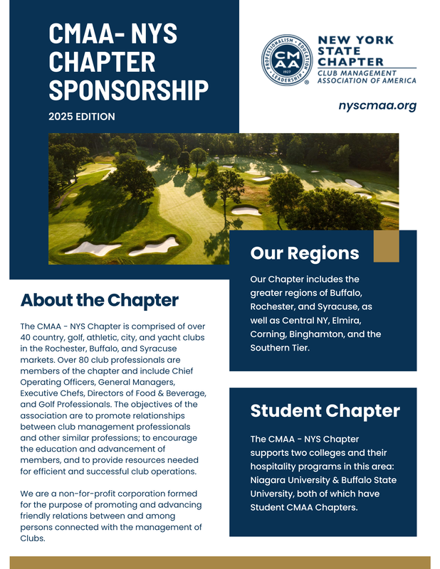 The New York State Chapter prides itself on providing the best educational opportunities to its members. With the support of our sponsoring vendors, managers will be afforded the chance to learn the necessary skills needed to be successful at their Clubs and earn their certifications through our National association. From food and beverage, insurance and technology to golf course maintenance and sports, every company that we work with on a day to day basis plays an integral part of the success of our clubs. With the help of the following sponsorships, CMAA - NYS Chapter will be afforded the opportunity to provide tremendous educations, scholarships and other forms of professional development for chapter members and students.